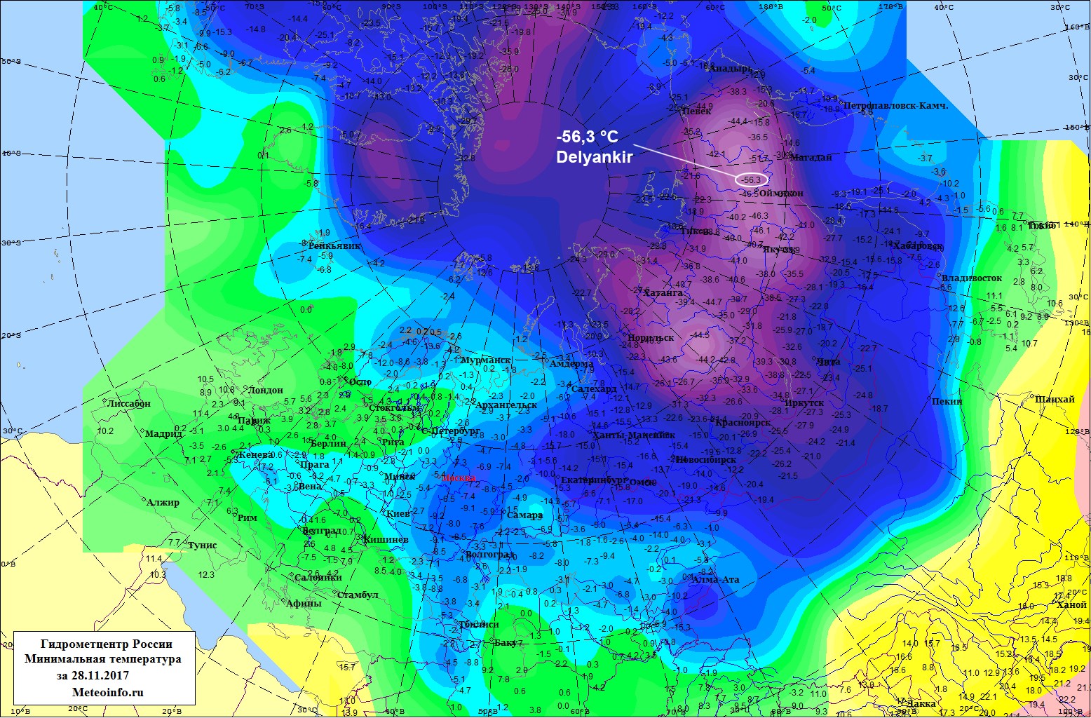 Il faudrait remonter à novembre 1997 pour trouver une température minimale plus froide en Yakoutie (-56,6°C le 2711/1997 à Olenek). Des températures inférieures à -56°C ont déjà été enregistrées en Yakoutie à la fin du mois de novembre, mais seulement à quelques occasions, notamment en novembre 1960 à Oïmiakon (-56,9°C le 28/11/1960 et -58,5°C le 29/11/1960 [record mensuel]) et à Verkhoïansk (-56,9°C le 29/11/1960 et -57,2°C le 30/11/1960 [record mensuel]) ou encore en novembre 1952 à Oïmiakon (plusieurs fois au cours de ce mois, avec une Tn remarquable de -57,8°C le 18/11/1952).
