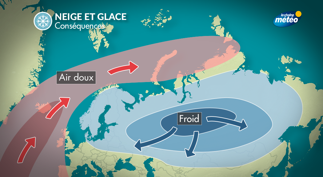 [ Neige en Sibérie, quel impact pour l'hiver en France?] Les prévisions saisonnières ont un peu changé (pour certaines) en faveur d'un scénario météo un peu plus froid que prévu initialement sur la France. Certains paramètres entrent partiellement en considération dans la prévision de la météo hivernale en Europe : parmi ces paramètres externes, la surface recouverte par la neige en Sibérie dès le mois d'octobre est un indicateur car la neige, ayant un fort pouvoir de réflexion (albédo) entraîne un refroidissement sur le continent et forme un super anticyclone. Parallèlement, cette année, l'air doux Atlantique remonte sur l'océan Glacial Arctique, ce qui retarde la formation de la banquise (extension actuelle très déficitaire pour la saison). Ces deux phénomènes peuvent modifier l'écoulement des masses d'air froid et faciliter le décrochage du vortex polaire vers l'Europe.