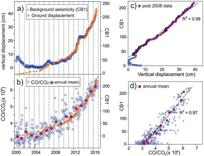 ( A ) Chronogramme de l' activité sismique de fond cumulative (points orange, CB1) et le déplacement vertical du sol à la station RITE CGPS; ( B ) le chronogramme de la sismique de fond cumulative (points orange, CB1) et fumerollienne CO / CO 2 ratios; ( C ) de tracé binaire de l' activité sismique de fond cumulative (CB1) vs le déplacement vertical du sol à la station RITE CGPS; ( d ) tracé binaire de la sismicité de fond cumulative (CB1) par rapport au rapport fumarolique CO / CO 2 (les points magenta se rapportent aux valeurs moyennes annuelles du rapport CO / CO 2 et du CB1).