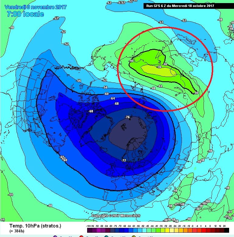 Pour faire suite, voici l'onde 1 selon ECMWF. Prévision de température de l'onde 1 au 18 octobre: