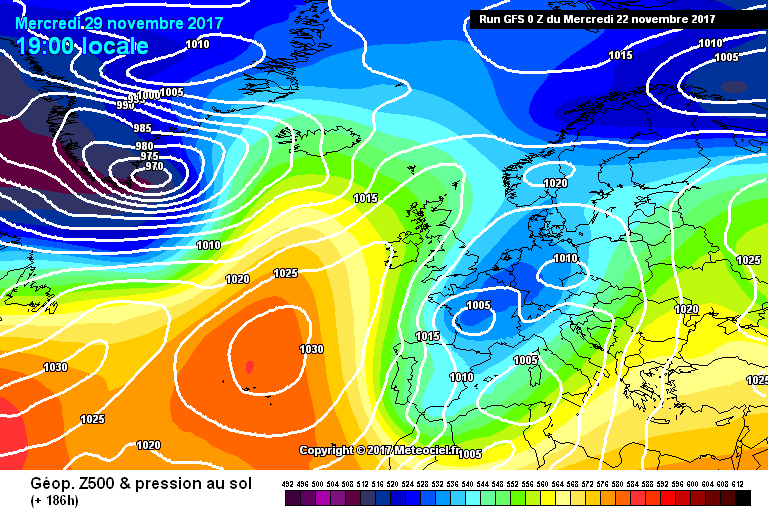 Situation générale : Une dépression devrais venir se positionner en plein sur notre pays tout en se dirigeant vers le sud-est de notre héxagone et d'un autre coté une belle dorsale qui s'élève jusqu'au Groenland ou le nord des Iles Britanniques selon les modélisations.