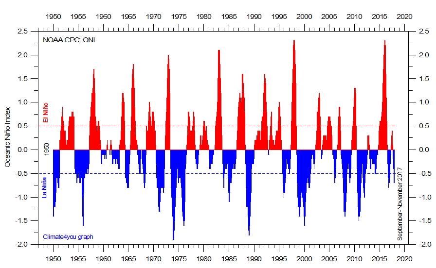 Cette année, on constate dans les grandes lignes que le vortex polaire est malmené, en phase avec un QBO Est et des vents zonaux affaiblis. La Nina, prévu assez faible, pourrait également jouer un rôle favorable pour un hiver froid. A l'inverse, une Nina plus forte a tendance à renforcer l'activité dépressionnaire sur l'atlantique nord et nous faire remonter Patator au gré des fluctuations. Actuellement, on observe une Nina qui a tendance à devenir modérée (proche de -1°C).