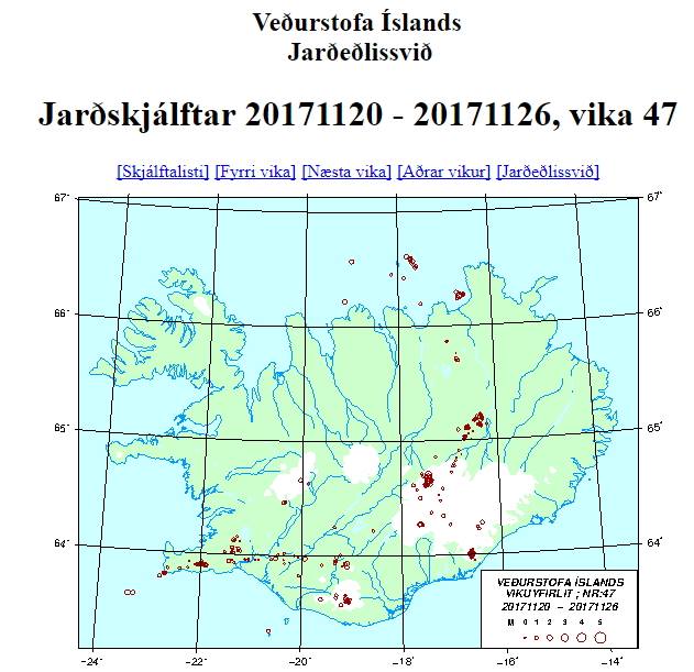 Environ 740 séismes ont été détectés la semaine dernière par le réseau sismique national de l'Office météorologique islandais, bien plus que la semaine dernière. Le plus gros tremblement de terre de la semaine dernière était de magnitude M3,2 à Bardarbunga le 3 décembre. L'activité sismique a augmenté à Öræfajökull où 160 séismes ont été détectés, contre 50 tremblements de terre la semaine précédente. Il y avait aussi une activité supérieure à la moyenne par le mont. Herdubreid. Trois tremblements de terre ont été détectés dans le mont. Hekla.