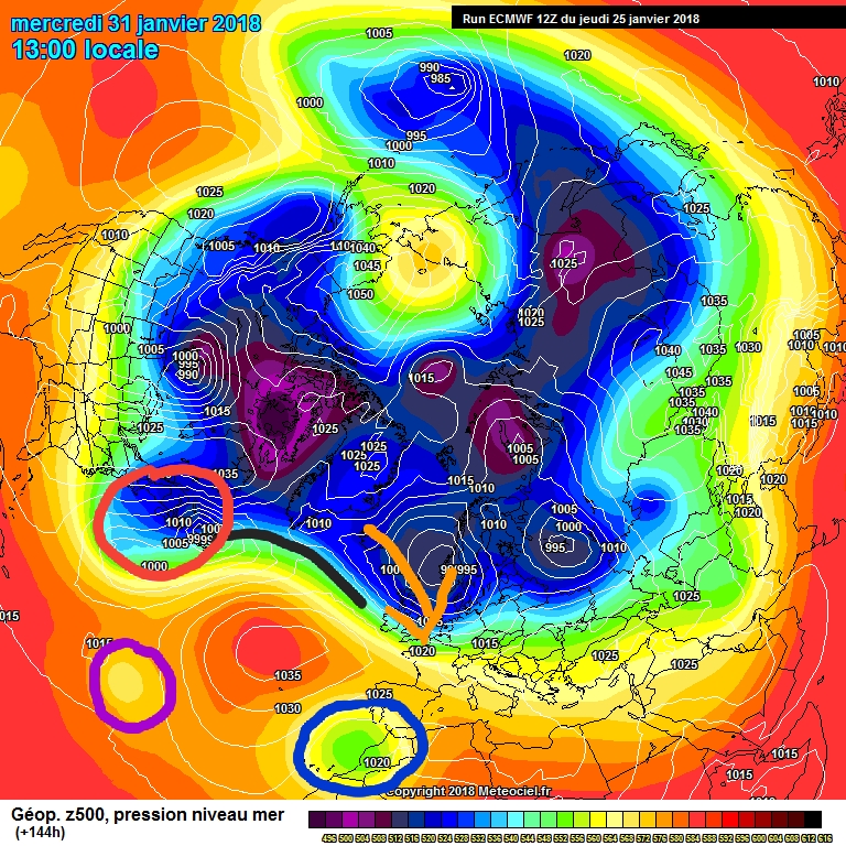 Cela donne une dorsale faiblarde, qui se raccroche aux hauts-géopotentiels qui se répandent du Svalbard à la Baltique, qui ne résistera pas à la puissante poussée de la dépression, sortie du Labrador et boostée par le vortex Canadien, qui va facilement la rabattre sur l'Europe.