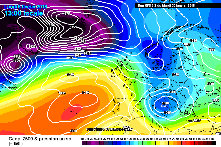 Pas vraiment de différences avec le scénario précédent, sauf que le thalweg Atlantique ne parvient pas à rejoindre la goutte froide Marocaine mais se jette en Méditerranée et amène le système dépressionnaire de mer du Nord à glisser en flux de nord puis de nord-est sur le pays, contraignant l'anticyclone des Açores à se rabattre entre Royaume-Uni et Islande, permettant à l'air froid continental d'être sérieusement drainé jusqu'à nous!