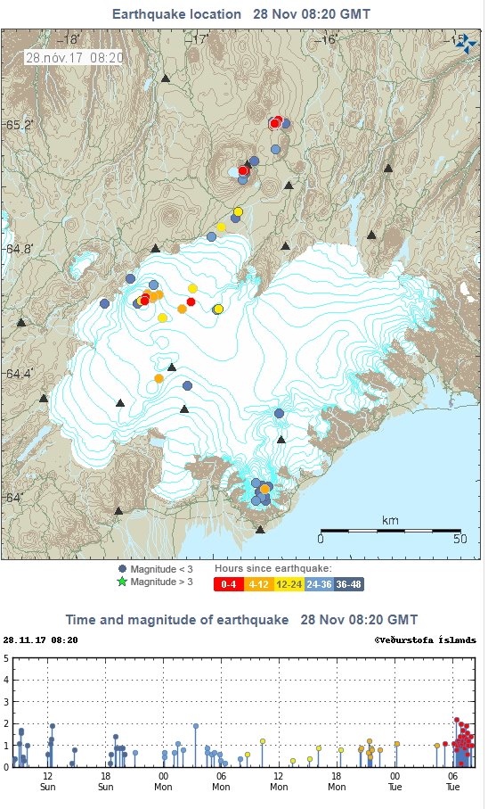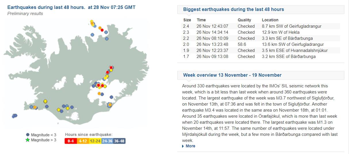 Environ 740 séismes ont été détectés la semaine dernière par le réseau sismique national de l'Office météorologique islandais, bien plus que la semaine dernière. Le plus gros tremblement de terre de la semaine dernière était de magnitude M3,2 à Bardarbunga le 3 décembre. L'activité sismique a augmenté à Öræfajökull où 160 séismes ont été détectés, contre 50 tremblements de terre la semaine précédente. Il y avait aussi une activité supérieure à la moyenne par le mont. Herdubreid. Trois tremblements de terre ont été détectés dans le mont. Hekla.