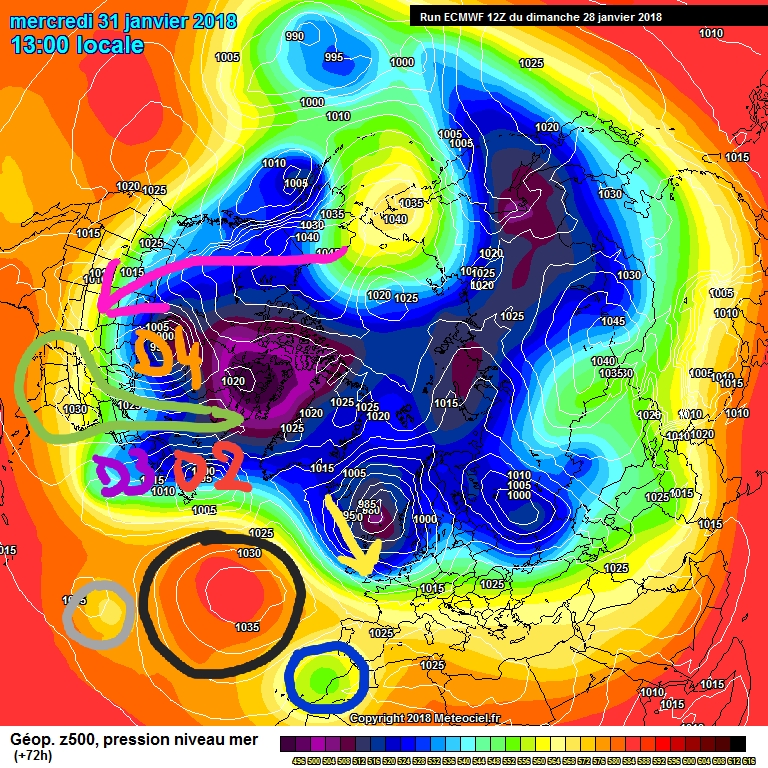 Cela donne une dorsale faiblarde, qui se raccroche aux hauts-géopotentiels qui se répandent du Svalbard à la Baltique, qui ne résistera pas à la puissante poussée de la dépression, sortie du Labrador et boostée par le vortex Canadien, qui va facilement la rabattre sur l'Europe.