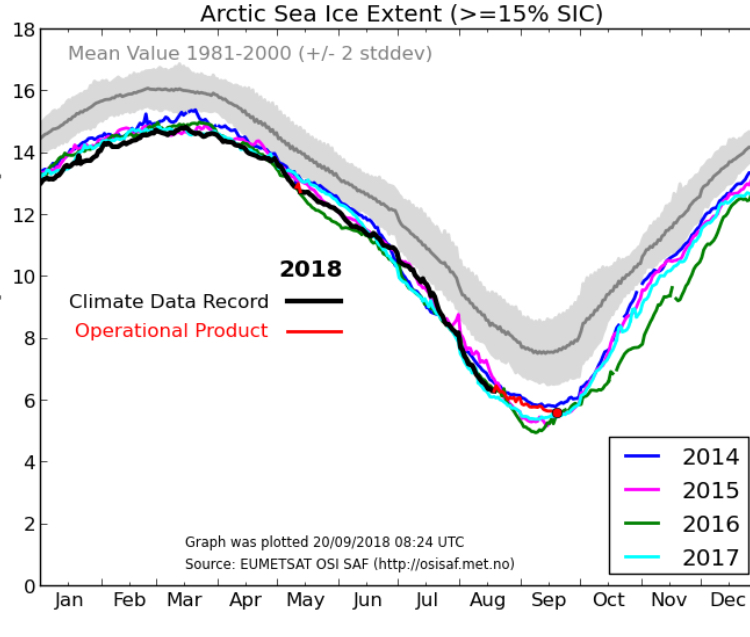 L'embâcle en Arctique débute, la surface au minimum était de 4 594 000 km2 ce mercredi 19 septembre.