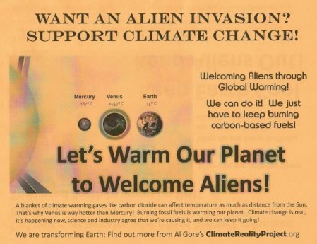 La signature du document est sans équivoque : « Laissez réchauffer votre planète et bienvenue aux Aliens ! » Pour en savoir plus le site de Al Gore : climaterealityproject.org !!!