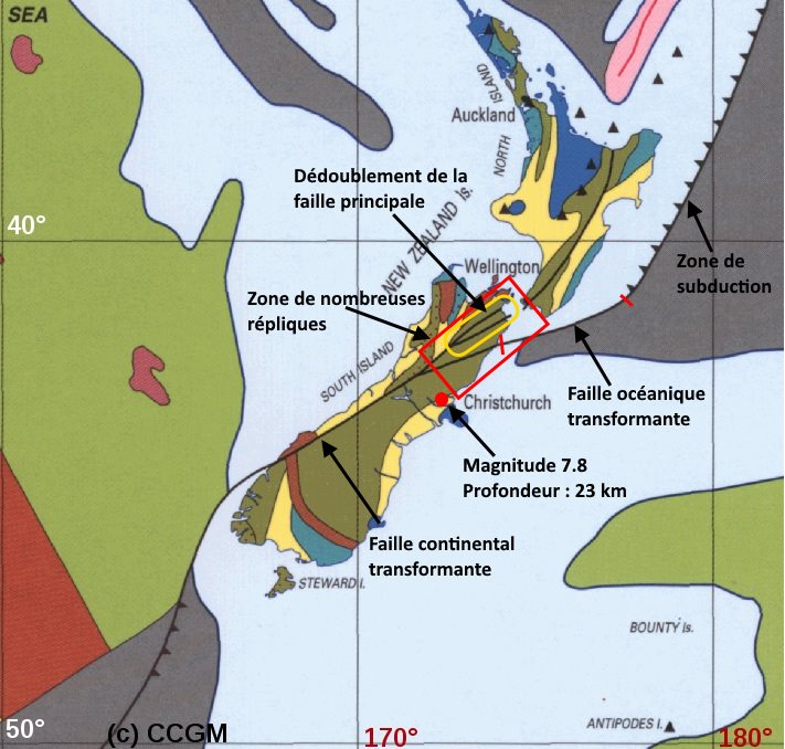 La zone de subduction s’arrête au niveau de la séparation entre l’île Sud et l’île Sud, sur quelques kilomètres avant de toucher la côte, on observe une faille océanique transformante, qui, à l’intérieur des terres, devient une faille transformante continental. Les séismes superficiels sont localisés sur les dorsales et le long des failles transformantes. En effet, seules les zones séparant deux axes de la dorsale sont le siège de séismes en raison du mouvement inverse des deux plaques dans cette zone. Cette faille transformante est la limite entre les plaques Pacifique et Australie au voisinage de la Nouvelle Zélande. La limite entre la plaque australienne, au Nord et à l’Ouest, et la plaque Pacifique, au Sud et à l’Est, est une fosse de subduction de l’Australie sous le Pacifique au Sud de la Nouvelle-Zélande, est de type transformant en Nouvelle-Zélande et prend alors le nom de faille alpine ( Alpine Fault ) traversant les Alpes de l’île Sud, puis repasse au Nord à une fosse de subduction mais, ici, du Pacifique sous l’Australie. Les nombreuses répliques au Nord de l’île sont aussi causées par la présence de deux failles transformantes par dédoublement de la faille principale.