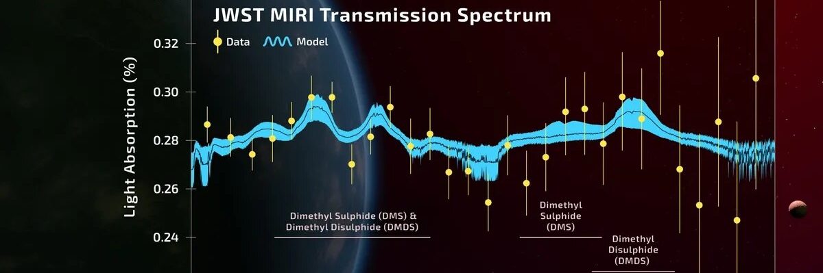Le graphique illustre les données spectrales recueillies par l’instrument MIRI du télescope James Webb, révélant la composition de l’atmosphère de K2-18b, une exoplanète située dans la zone habitable de son étoile. © A. Smith, N. Madhusudhan – Université de Cambridge