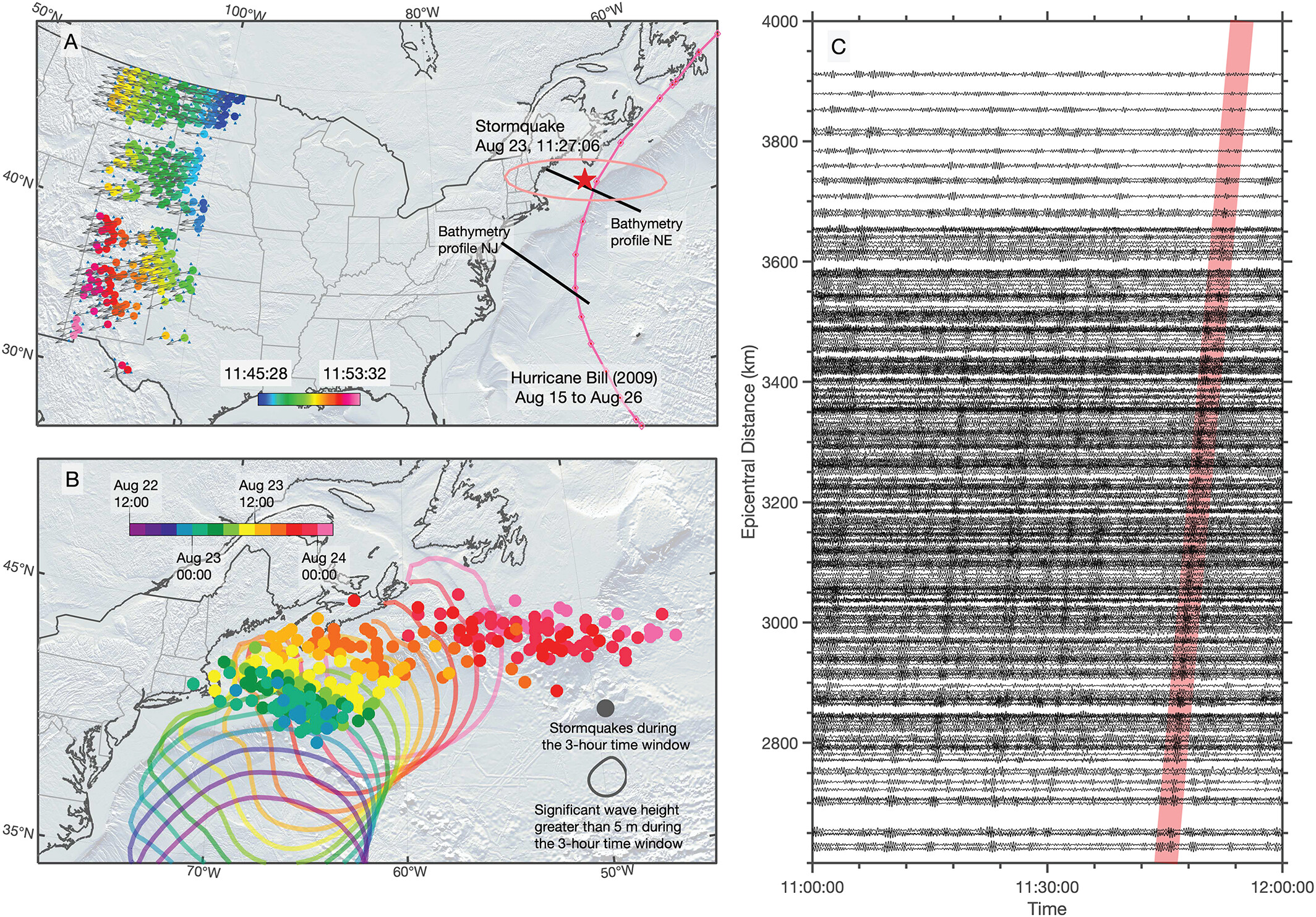 Figure 2 Séismes de tempête provoqués par l'ouragan Bill (2009). (a) Champ d'ondes de Rayleigh généré par le séisme de tempête au large de la Nouvelle-Angleterre le 23 août à 11 h 27 min 06 s (étoile rouge). L'ellipse montre l'incertitude de localisation du séisme de tempête (Fan et al., 2018 ). Les heures d'arrivée des ondes de Rayleigh et les directions de propagation à chaque sous-réseau (triade) sont représentées par des points et des flèches de couleur. La ligne rose montre la trajectoire de l'ouragan Bill (2009 ; Landsea et Franklin, 2013 ). (b) Séismes de tempête migrant avec l'ouragan Bill (2009) le long du plateau continental sur une période de 30 heures. Les régions avec une hauteur de vague significative supérieure à 5 m sont représentées par des contours colorés, en utilisant WAVEWATCH III à une résolution de 3 heures (Tolman, 2014 ). (C) Formes d'onde filtrées par bande passante auto-normalisées sur une heure (20 à 50 s) alignées avec l'épicentre détecté du séisme de tempête en (a). La bande rouge met en évidence les formes d'onde associées au séisme de tempête détecté en (a).