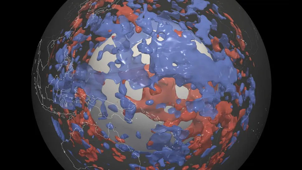 Le nouveau modèle montre des taches dans le manteau terrestre où les ondes sismiques voyagent plus lentement que d'habitude (en bleu), ce qui suggère qu'il pourrait s'agir de morceaux de dalles subductées. (Crédit photo : Sebastian Noe/ETH Zurich)