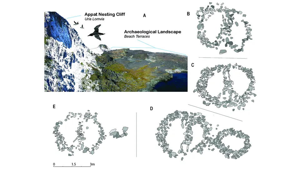 Illustration de plusieurs cercles de tentes paléo-inuits anciens découverts sur l'île d'Isbjørne. (Crédit image : M. Walls, M. Kleist & P. Knudsen ; Antiquity Publications Ltd)