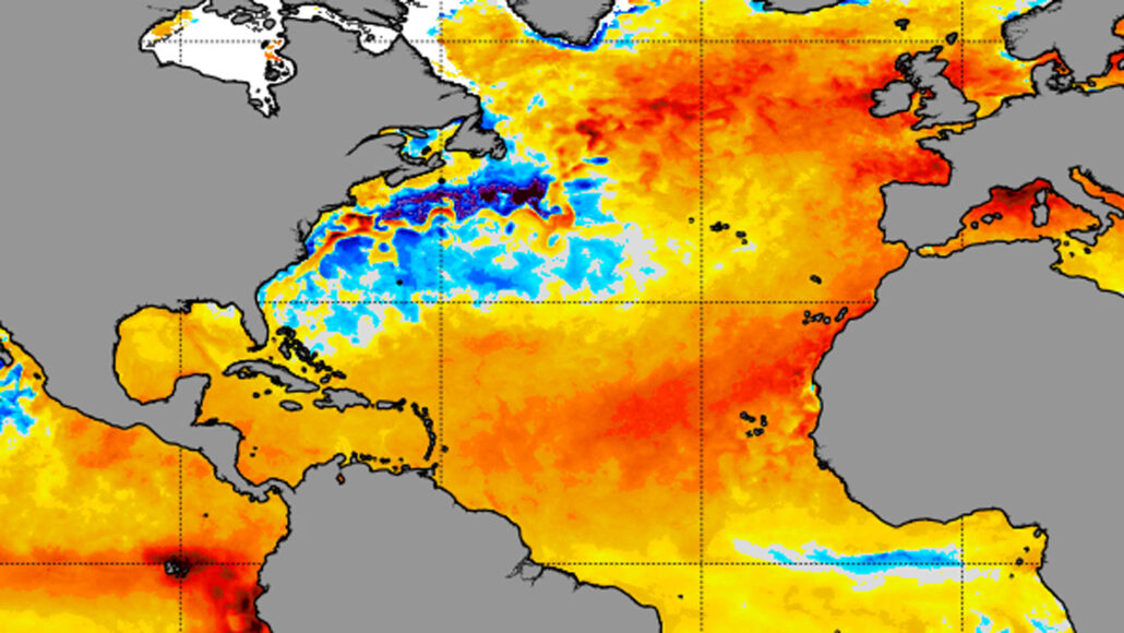 De vastes zones de l'Atlantique Nord présentent des températures bien supérieures à la normale (orange et rouge) pour cette période de l'année, une tendance qui pourrait avoir une incidence sur la prochaine saison des ouragans. NOAA