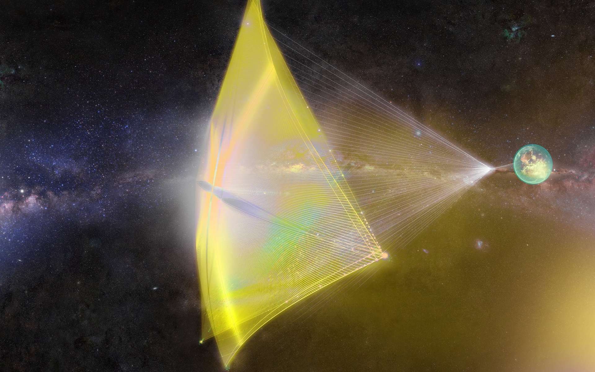 Vue d'artiste de la voile photonique propulsée par des faisceaux laser. Credit Breakthrough Starshot