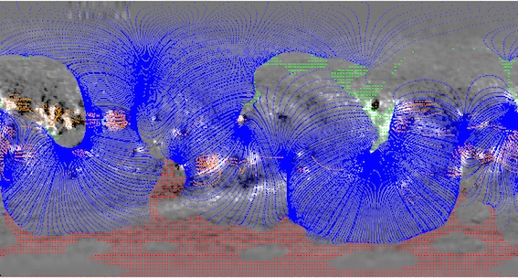 Les taches solaires (sans parler de leurs complexité magnétique) se trouve en bordure de zone de polarité différentes (+/-) qui elles sont connectées avec le champ magnétique (liaison en bleu sur l'image de dessous et en vert pour l'image du post en dessus (changement de polarité du soleil)).. Image du 13 mai..
