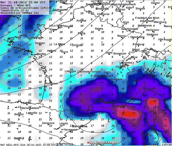 voici les dernières prévisions des modèles pour mercredi 31 octobre 2012. Une forte alerte peut être déclenchée pour la région de Perpignan, Montpellier, les bouches du Rhone, le Var et la Corse. Les zones en rouge peuvent connaître de grosses inondations :!: