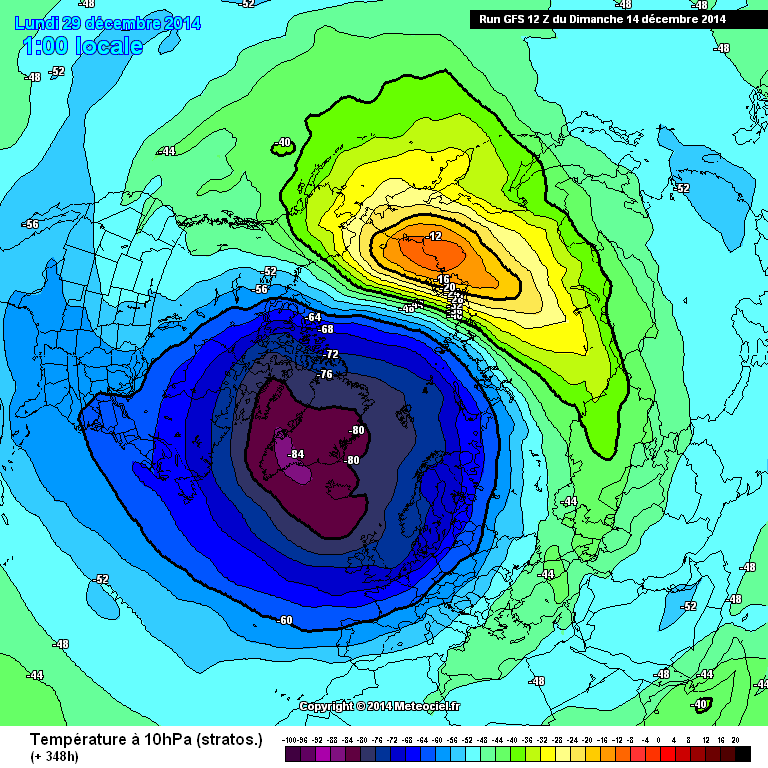 Salut Frudjo! Non, non, tu ne dis pas de bêtises, d'autant qu'il est bien modélisé depuis quelques jours sur Gfs, et qu'il est vu se renforçant. On peut constater également que la visibilité sur les runs semble meilleure depuis cette prévision sur la stratosphère. On voit clairement pour la fin décembre une montée de Hp sur le Groënland, mais on ne verra probablement pas les effets avant 2015 ;-) (y a de grosses chances pour début janvier! :coeur: :chance: )