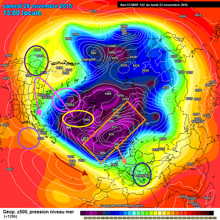 On retrouve la même carte que précédemment et quasi le même scénario sauf que la dépression en sortie du Labrador a rejoint le côté oriental de la dorsale.