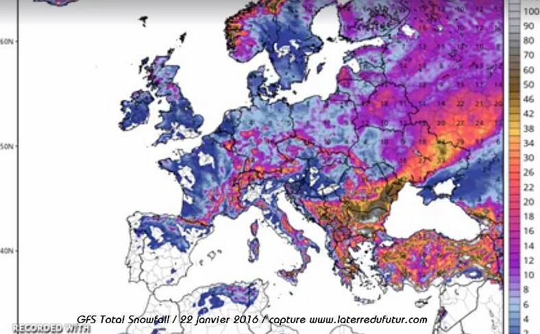Voici les hypothétiques chutes de neige prévues pour le 22 janvier 2016 selon GFS :
