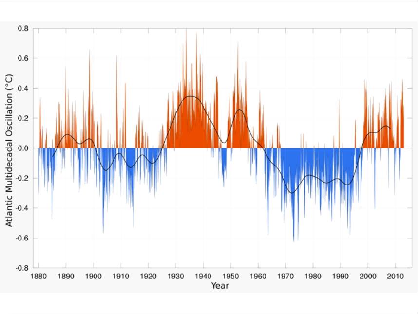 "[Climat / hivers froids] Les discussions vont bon train sur le retour éventuel d'un nouveau cycle d'hivers froids en Europe de l'ouest. On a beaucoup parlé des indices divers et variés (Nino/Nina, QBO, cycles solaires, etc...). Malgré tout, il semblerait que l'Europe de l'ouest soit encore dans un cycle chaud, ce qu'envisagent globalement assez bien les modèles saisonniers. Ces modèles prennent en compte un indice certainement très important : l'oscillation Atlantique multidécennale AMO (multidecadal, en anglais). En effet, l'océan Atlantique obéit à des cycles de température de surface qui varient environ tous les 20 à 30 ans : les phases froides correspondent aux hivers les plus froids enregistrés en France. Depuis l'an 2000, cette phase est chaude, ce qui laisse à penser qu'il ne faut pas attendre de grand changement climatique en France avant 2020 (hormis de petites variations intermédiaires de 10 à 11 ans environ, au sein de ces grands cycles).