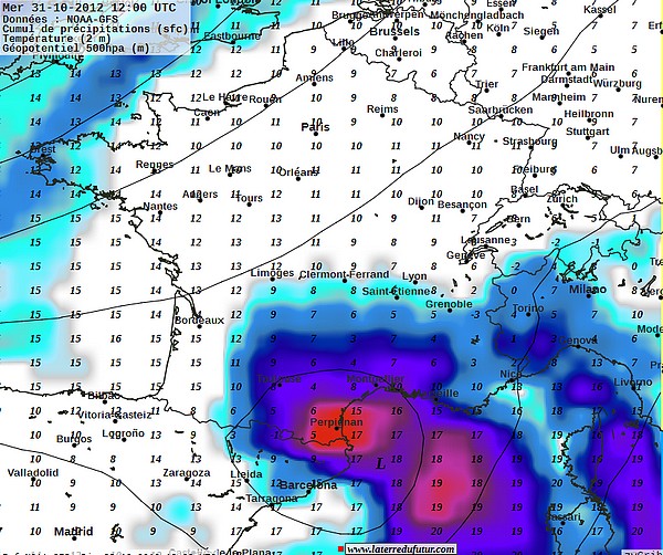 voici les dernières prévisions des modèles pour mercredi 31 octobre 2012. Une forte alerte peut être déclenchée pour la région de Perpignan, Montpellier, les bouches du Rhone, le Var et la Corse. Les zones en rouge peuvent connaître de grosses inondations :!: