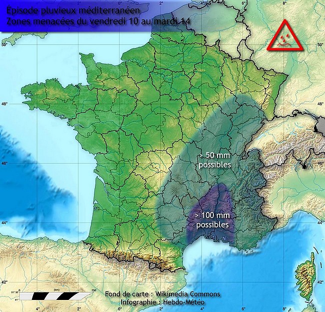 12h30 : à partir de la fin d’après-midi et au cours de la nuit prochaine (nuit de vendredi à samedi) l'intensité des pluies va reprendre sur le Gard apportant des cumuls de l’ordre de 50 à 100 mm voire localement plus de 150 mm de nouveau en quelques heures, selon Météo France