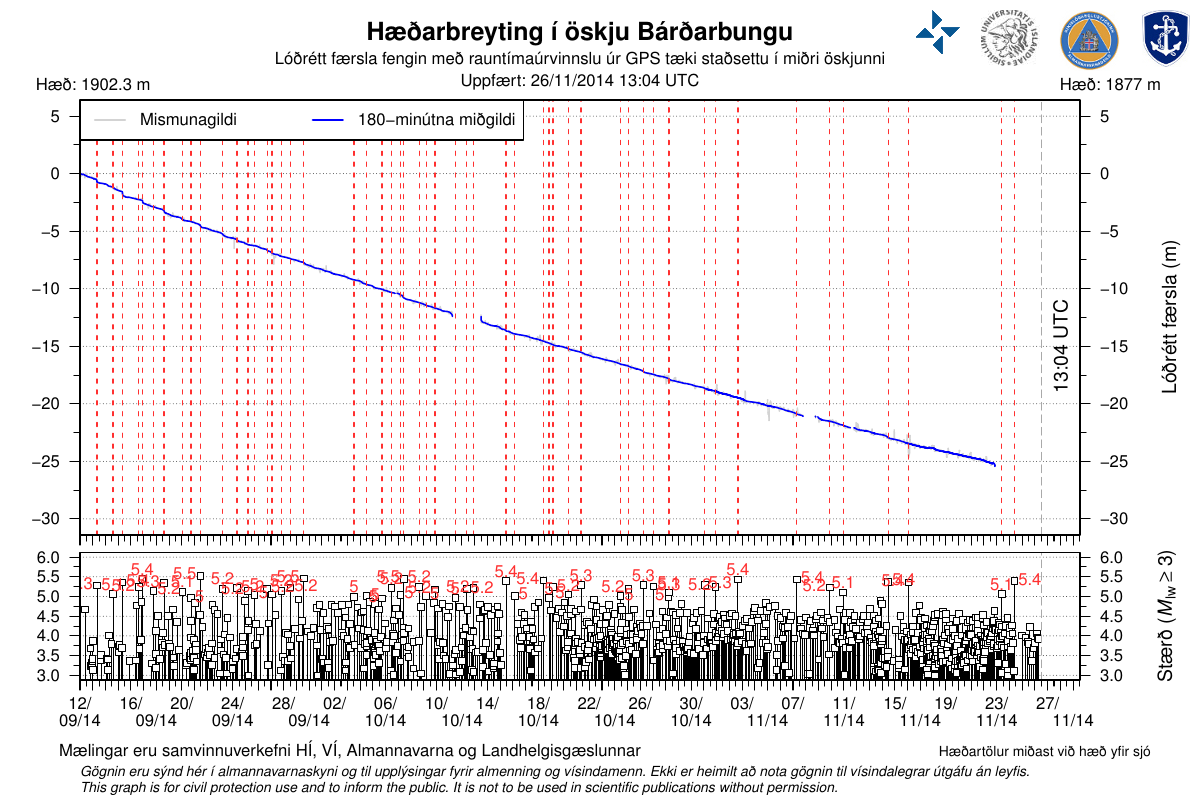  Première analyse du nouveau sismographe, qui a été installé sur Bárðarbunga le 11 Novembre, au Québec montre les tremblements de terre dans la caldeira Bárðarbunga origine dans les trois plus hautes kilomètres de la croûte de la terre. Cela indique que le magma est plus proche de la surface de la terre que ce qui était estimé auparavant.