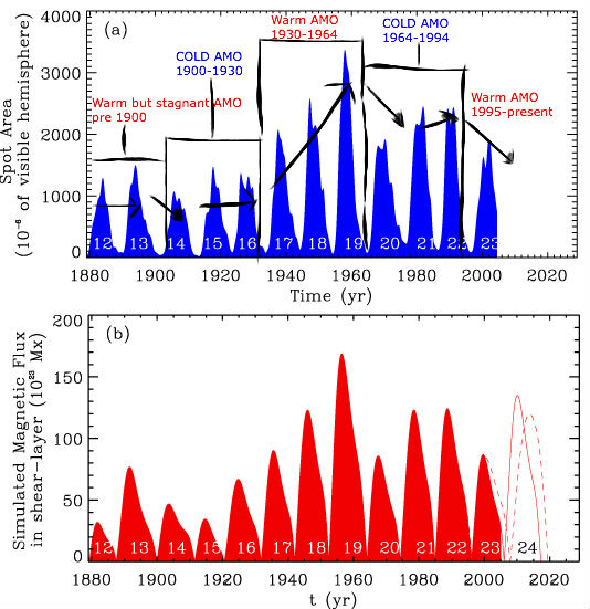 Voici un graphique qui démontrerait que l'activité solaire et l'AMO ont bien une corrélation très étroite :