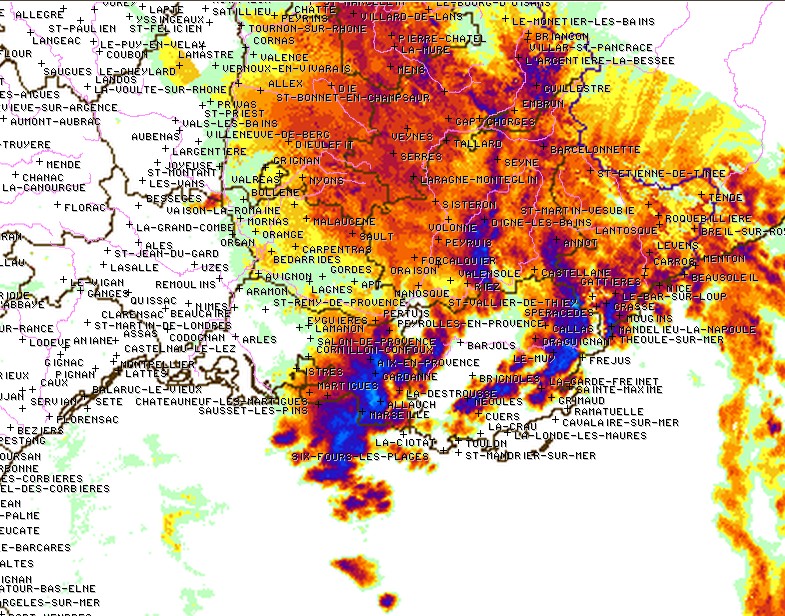 Image radar en cours des orages, la région des cevennes est particulièrement touchée actuellement :