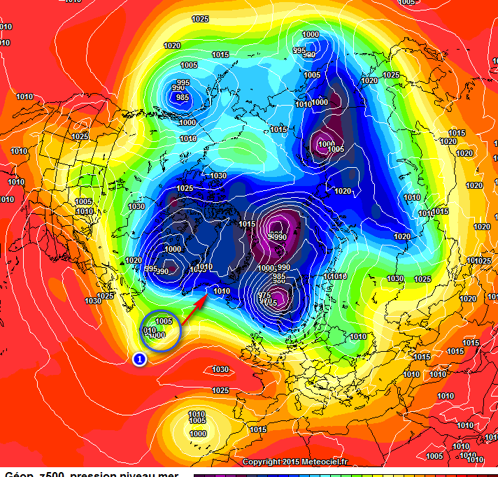 Ce minimum dépressionnaire va, selon le tracé que je vous ai indiqué sur l'image ci dessus, renforcer le vortex polaire sur son flanc Ouest, vous le trouvez ci dessous en cercle rouge et numéro 1 :