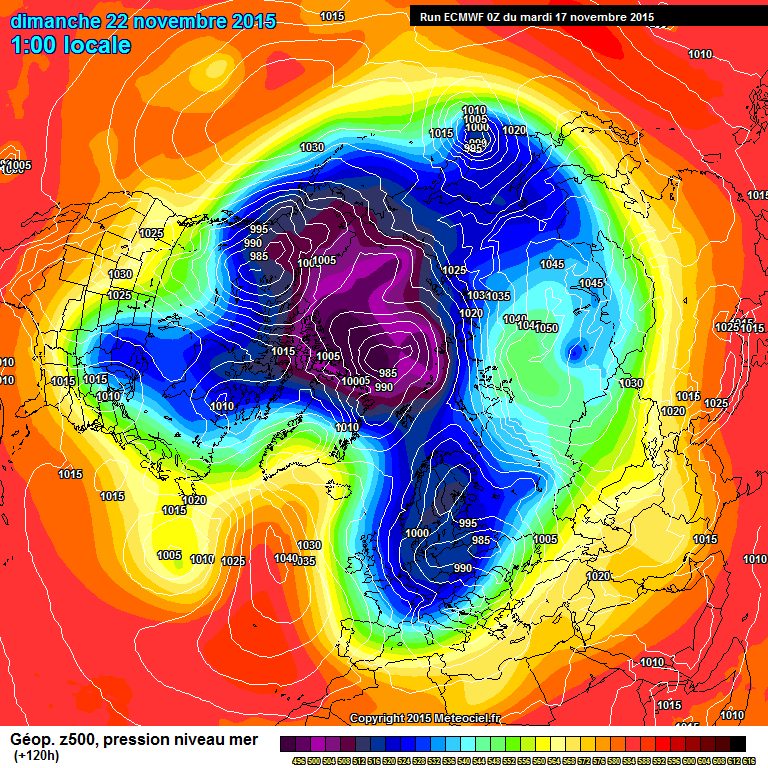 Ce qui est intéressant c'est de prendre de la hauteur à l'échelle hémisphérique pour comprendre les différents mécanismes à l'oeuvre. L'on voit sur le modèle Européen CEP à 120 heures la mise en place d'une vaste dorsale anticyclonique qui tend à rejoindre le Groenland. Cela favorise sur l'Europe l'écoulement des masses d'air froid dans un flux de Nord à Nord-ouest. Une partie du vortex polaire troposphérique est d'ailleurs attirée vers la Scandinavie qui va voir l'installation de l'hiver certainement dans la durée. Sur le Canada en amont de la dorsale anticyclonique se produit une descente froide polaire avec une dépression assez creuse.