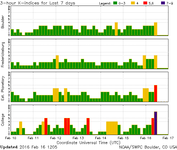 On peut remarquer sur les régions du cercle polaire comme l'Alaska ou encore la Suède, l'indice géomagnétique est monté jusqu'à Kp=6 donc un niveau de tempête géomagnétique modérée G2 ce qui est normale puisque le bouclier magnétique est moins important à ces latitudes.