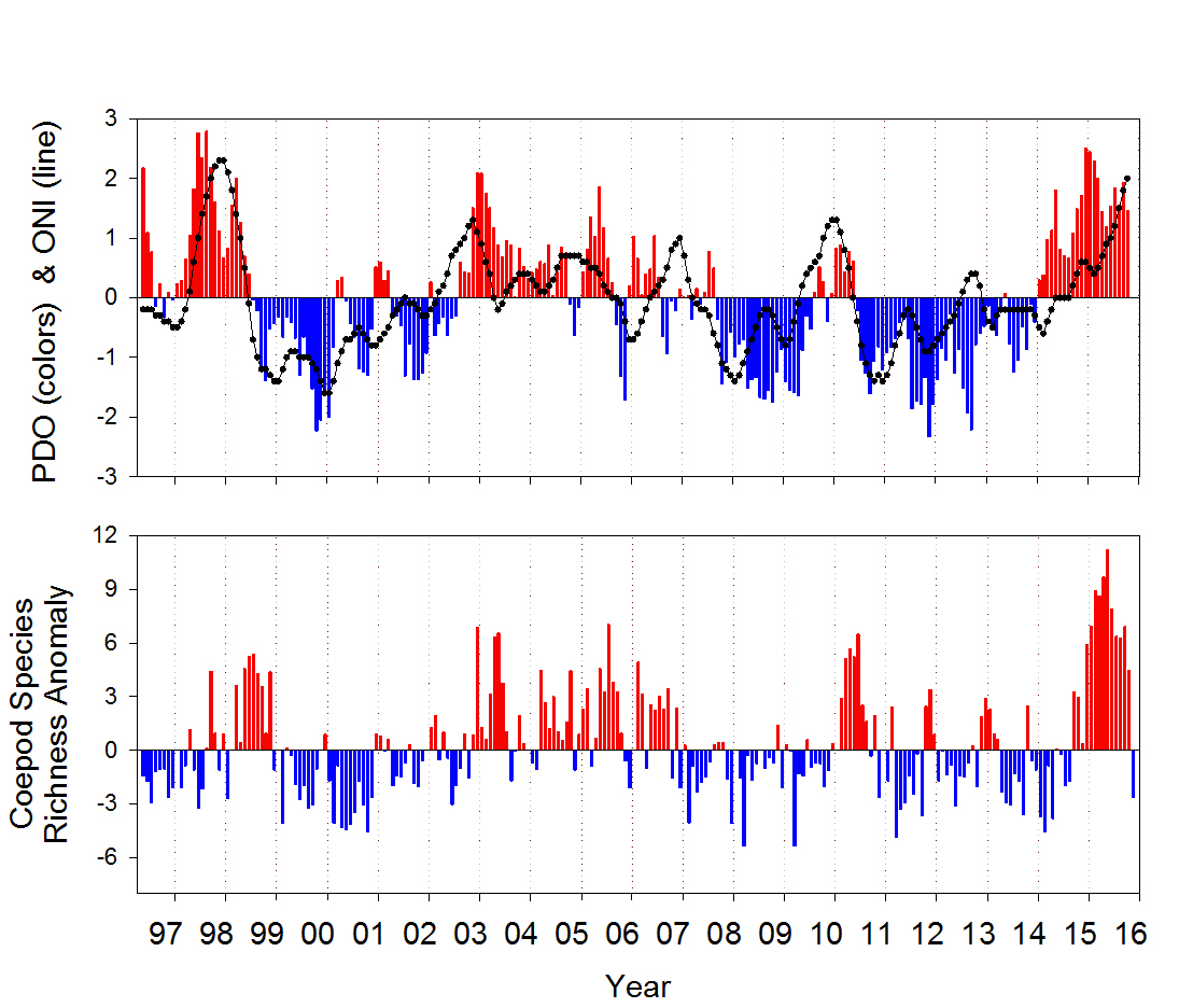 L'évolution de la PDO et du ONI (Oceanic Index Niño) de 1997 à 2016.