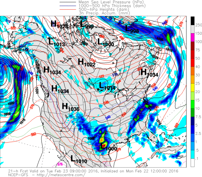 Une dépression se creuse sur les plaines centrales des Etats-Unis. Le flux en altitude va changer de direction en passant d'un axe Ouest à Sud-Ouest en direction du Nord-Ouest. Le jet-stream en altitude ne sera pas tellement présent et marqué, mais c'est surtout le jet de basse-couche qui va rendre la situation plus dynamique. La dépression va évoluer dans l'ondulation de ce jet-gust, ce qui aura pour conséquence, un renforcement du creusement de cette dépression. A l'arrière de cette dépression, une fort advection d'air froid en altitude arrive en provenance du Nord-Ouest. Cela provoque donc une forte déstabilisation des profils verticaux, d'où un risque d"orages localement forts pour ce Mardi 1er et Mercredi 2 Mars 2016. La MUCAPE pourrait atteindre des valeur autour de 1000 à 1500 j/kg très localement avec des indices de soulèvement qui s'abaisse jusqu'à -5K en générale voir -7K localement près des côtes du Golfe du Mexique. La situation pourrait être favorable aux développements e phénomènes tourbillonnaires avec une convergence marquée au niveau du sol et quelques bons noyaux d'hélicité en très basse-couche.