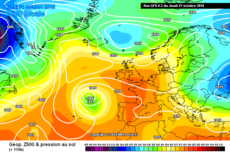 "L'ensuite est éloigné mais... on pressent depuis quelques temps un profond changement de temps concomitant à celui de mois. Notre anticyclone de fin octobre nous abandonnerait en migrant du côté de l'Islande et du Groenland. Nous serions alors, aux alentours du 1er ou 2 novembre, soumis à une "descente" d'air arctique. L'ambiance se refroidirait alors brutalement (nous pourrions perdre de l'ordre de 10° en 24h voire 15° en 36 ou 48h) et nous plongerait en hiver. Cet air arctique est en général instable, la mer du Nord (chaude l'automne) se chargerait de le réchauffer à la base et de lui apporter de l'humidité... Toujours dans cette hypothèse (n'oublions pas que l'on cause à J+7 ou 8), des chutes de neige plus ou moins généralisées au dessus de 300-500 m pourraient bien nous concerner..."