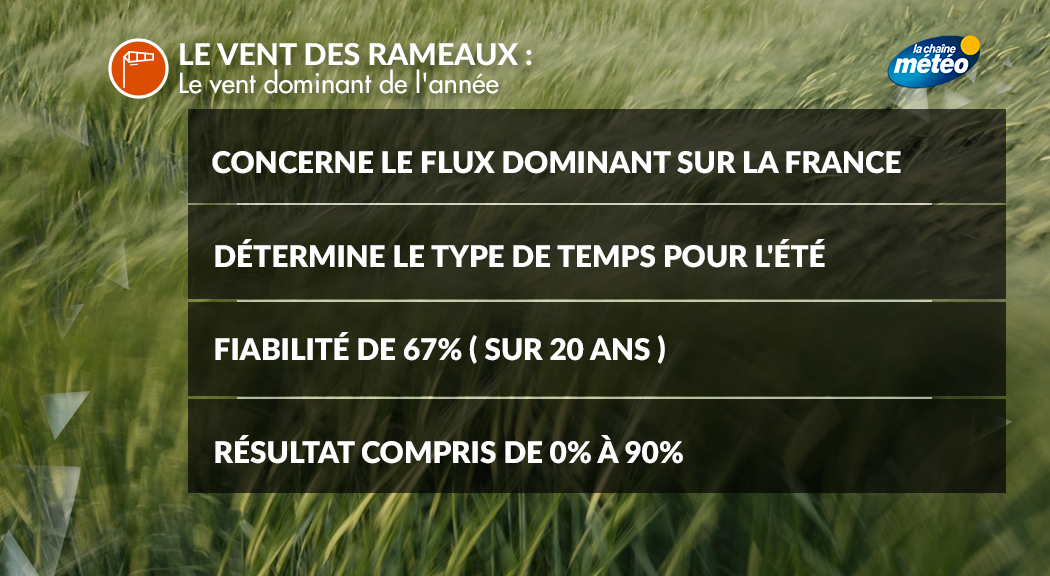 Il y avait bien longtemps que je n'étais pas intervenue sur ce topic mais aujourd'hui je voudrais revenir sur un dicton qui m'interpelle tout particulièrement. Tout comme le dicton de la veille de la Toussaint où l'orientation des vents le soir du 31 Octobre donne une tendance sur l'hiver qui s'en suit, voici un autre dicton populaire mais cette fois il faut regarder l'orientation des vents le jour des rameaux. Ce dicton est très scruté par les jardiniers : d’après ce vieux dicton populaire " le vent des rameaux est le vent dominant de l'année, notamment de l'été". Les Rameaux ne sont pas qu' une date chrétienne , c' est aussi une date précise dans le ciel par rapport à la première lune suivant l' équinoxe de printemps. C'est donc dimanche prochain : on s'attend à un petit flux de sud à sud-ouest, ce qui serait propice à un été chaud et humide (= orageux). Curieusement, cela rejoint les prévisions saisonnières! Indiquons que ce dicton se vérifie à environ 67% sur ces 20 dernières années, avec des taux de vérification compris de 0% à 90%.