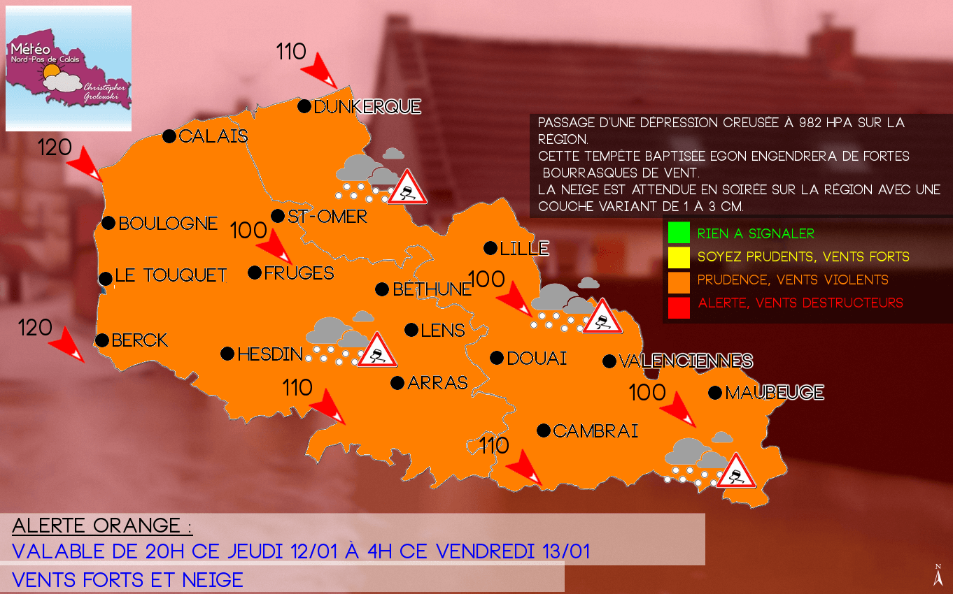 Le front froid de la dépression explosive Egon est en train de balayer le Nord-ouest de la France. A son passage, le vent peut dépasser 100 km/h dans les terres sous les plus gros grains. Mais c'est entre 21h et 1h du matin que la situation va devenir critique car la dépression passera au Nord de la Seine et sera alors très creuse avec un fort gradient juste à l'arrière du front (baisse brutale des températures et risque d'orages de grêle et neige). Les rafales de vent pourraient alors atteindre 130/140 km/h dans les terres entre le Nord de la Seine-Maritime, l'ensemble du département de la Somme et le Nord de l'Aisne. Envoyez-nous vos vidéos ici, vos photos, observations via nos applications sur les 19 sites internet de Meteo-Villes.